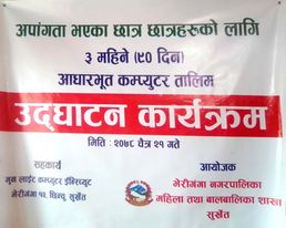 सुर्खेत। भेरीगंगा नगरपालिकामा ३ महिने आधारभुत कम्प्युटर तालिम भएको छ । आधारभुत कम्प्युटर तालिम भेरीगंगामा रहेका अपाङ्गता भएका छात्र छात्राहरुको लागि कम्प्युटर तालिम दिन लागिएको हो ।