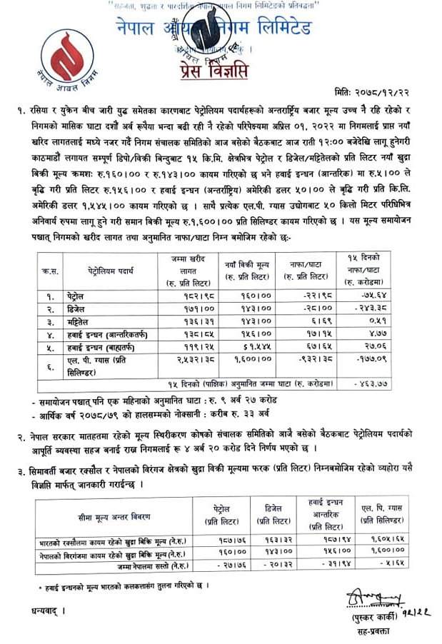 यो सँगै अब पेट्रोलको मूल्य प्रतिलिटर एक सय ६० रुपैयाँ पुगेको छ । त्यस्तै डिजल र मट्टीतेलको मूल्य प्रतिलिटर एक सय ४३ रुपैयाँ पुगेको छ । खाना पकाउने ग्यास प्रतिसिलिन्डर १६ सय रुपैयाँ पुगेको छ ।