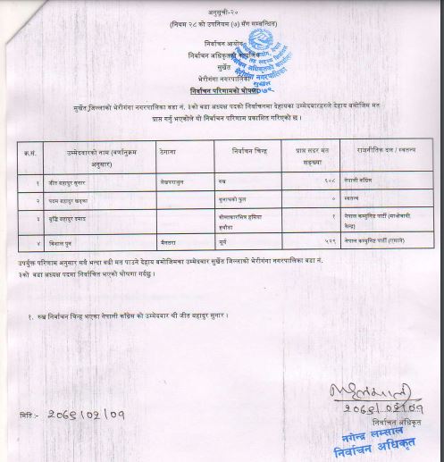 सुर्खेत । भेरीगंगा नगरपालिका वडा नम्वर ३ लेखपराजुलमा नेकपा (माओवादी केन्द्र) का उम्मेदवारले जम्मा १ मत पाएका छन् । अध्यक्षमा उम्मेदवारी दिएका माओवादी केन्द्रका बुद्धी बहादुर दमाईले १ मत पाएका हुन् ।