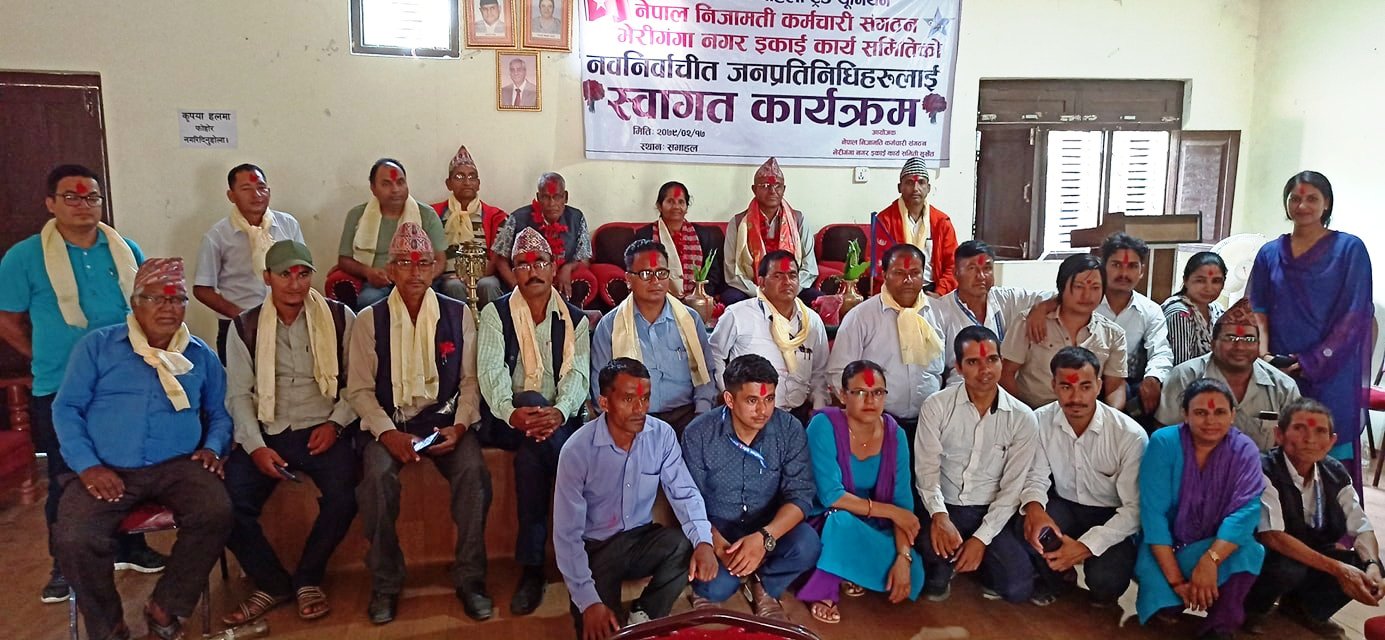 सुर्खेत । नेपाल निजामती कर्मचारी संगठन भेरीगंगाले नवनिर्वाचीत जनप्रतिनिधीहरुलाई स्वागत गरेको छ । मंगलबार नेपाल निजामती संगठन नगर ईकाई समिती भेरीगंगाकाको आयोजनामा भएको कार्यक्रममा प्रमुख अतिथी समेत रहनु भएका नगर प्रमुख यज्ञ प्रशाद ढकालले जनतालाई केन्द्रविन्दुमा राखेर काम गर्न कर्मचारीहरुलाई सुझाव दिनुभएको छ । समृद्ध भेरगिंगा निर्माण गर्नका लागी जनप्रतिनिधी र कर्मचारी एक आपसमा समन्वय गरी अगाडी बढ्नु पर्ने उहाँले बताउनुभयो । यस्तै सेवा प्रवाहलाई जनमैत्री बनाउनकालागी बोली, भाषा र सेवाग्राही संगको व्यवहार सरल हुनुपर्ने नगर प्रमुख ढकालको भनाई रहेको थियो ।