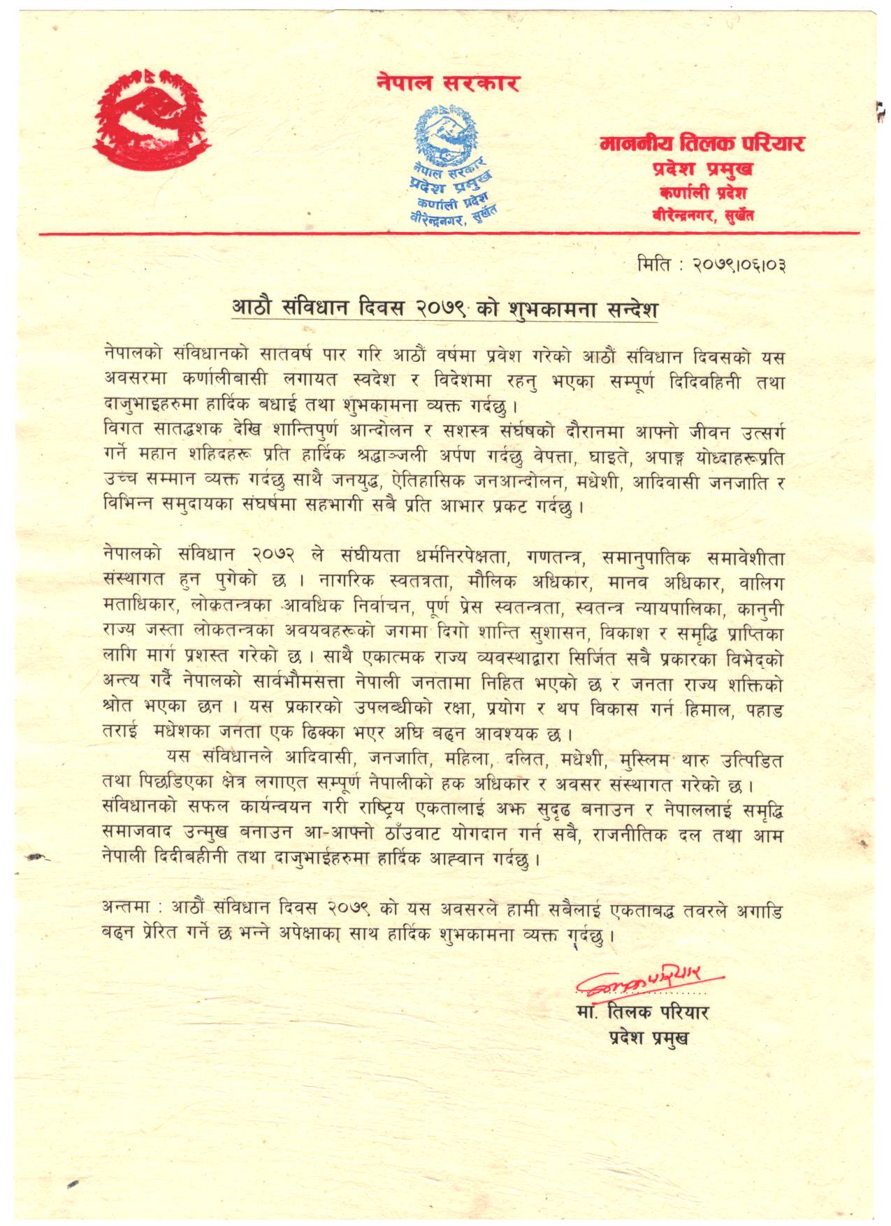 नेपालको संविधान सात वर्ष पुरा गरी आठौँ वर्षमा प्रवेश गरेको अवशरमा कर्णालीबासी लगाएत स्वदेश तथा विदेशमा रहनु भएका सम्पुर्ण नेपाली नागरिकहरुमा शुभकामना व्यक्त गरेका हुन् । विगत सात दशक देखी शान्तीपुर्ण आन्दोलन र शसस्त्र संर्घसको दौरानमा जिवन उत्सर्ग गर्ने महान सहिदहरुप्रती हार्दीक श्रद्धान्जली अर्पण गर्दै वेपत्ता, घाईते, अपाङ्ग भएका लगाएत सबैमा शुभकामना मार्फत आभार समेत व्यक्त गरेका छन् ।