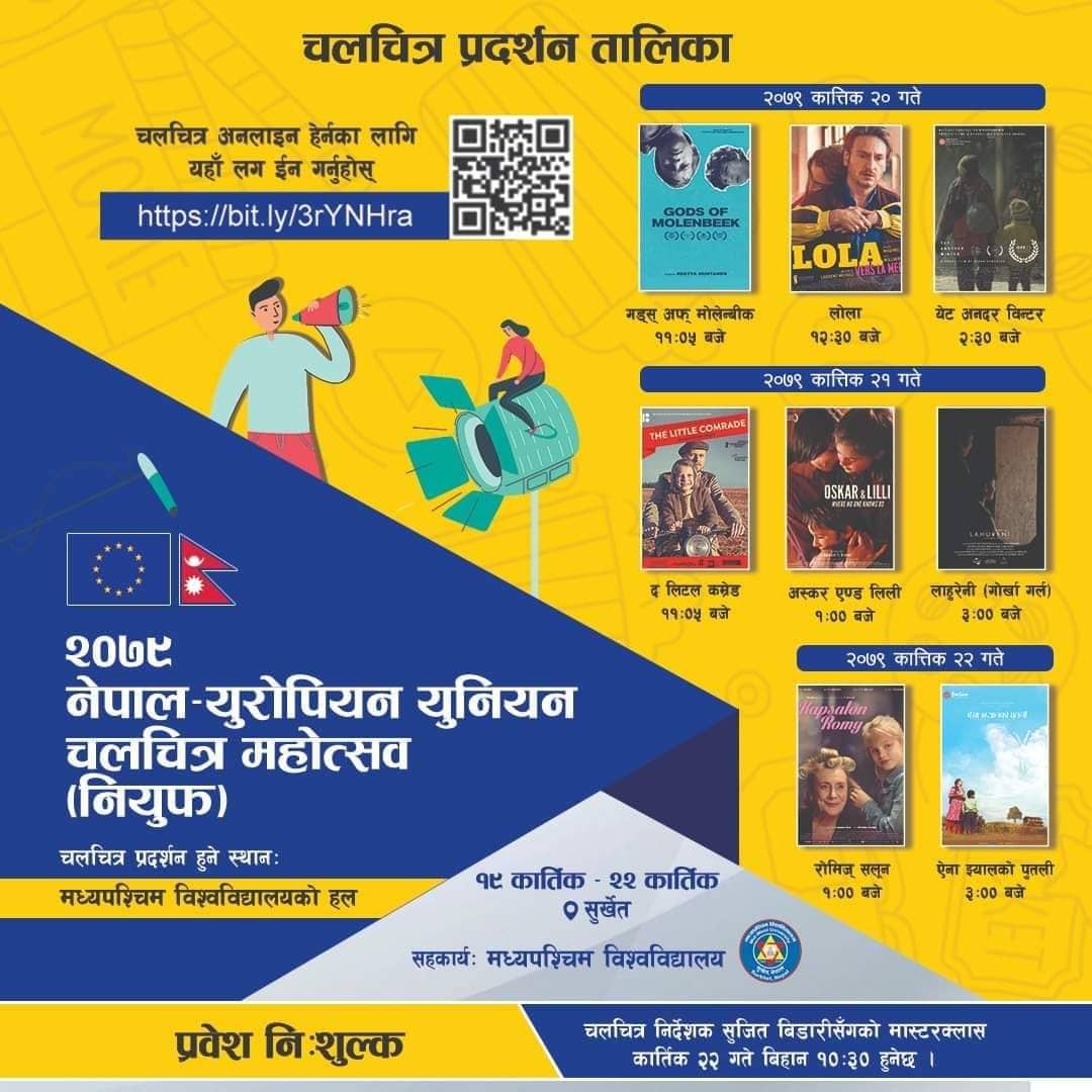 सुर्खेत । नेपालस्थित युरोपियन युनियनको डेलिगेशनले ११ औँ नेपाल युरोपेली युनियन चलचित्र महोत्सव पहिलोपटक सुर्खेतमा आयोजना गर्ने भएको छ । चलचित्र महोत्सव यही कात्तिक १९ देखि २२ गतेसम्म मध्यपश्चिम विश्वविद्यालयको कुइनेपानीस्थित सेमिनार हलमा आयोजना हुन लागेको हो । निःशुल्क हेर्न सकिने महोत्सवमा ५ युरोपियन र ३ नेपाली चलचित्र प्रर्दशन गरिनेछ ।