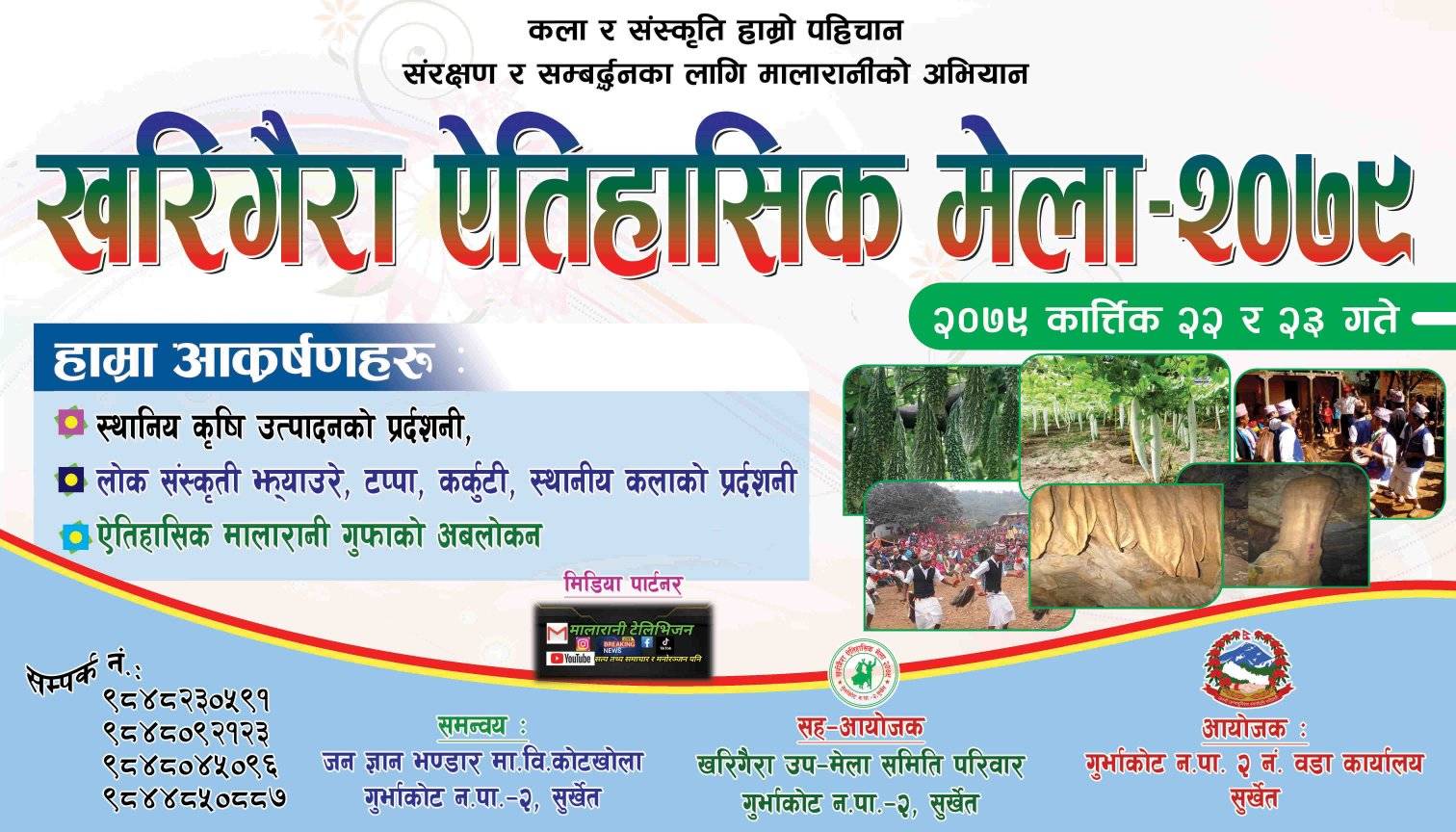 हुम बहादुर कार्की गुर्भाकोट । गुर्भाकोट नगरपालिका वडा नम्बर २ स्थित जन ज्ञान भण्डार मा बि कोटखोलाको प्राङ्गणमा बिगत देखि लाग्दै आएको ऐतिहासिक खरिगैरा मेला यस बर्ष कार्तिक शुक्ल पुर्णीमा २२ र २३ गते लाग्ने भएको छ । कला र सस्कृतीको हाम्रो पहिचान, संरक्षण र सम्बद्र्धनका लागि मालारानी को अभियान भन्ने उद्देश्यका साथ गुर्भाकोट नगरपालिका वडा नम्बर २ कोे आयोजनामा र मा बि कोटखोलाको समन्वय साथै ऐतिहासिक खरिगैरा मेला ब्यबस्थापन समितिको सहआयोजकमा मेला सुरु हुन लागेको हो ।