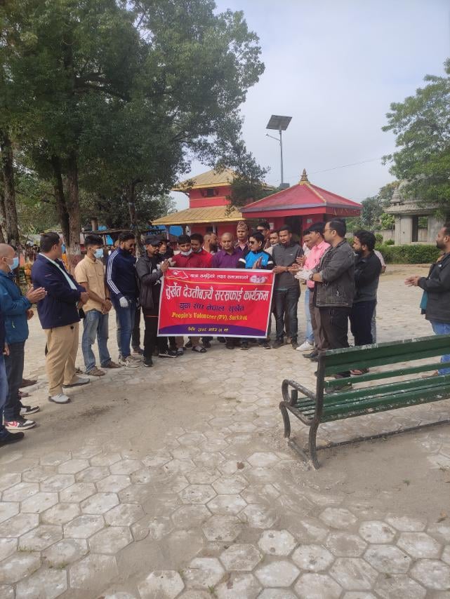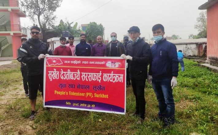 सुर्खेत । पिपुल्स भोलेन्टीयर र युवा संघ नेपाल सुर्खेतले देउती बज्यै मन्दीर परिसर सरसफाई गरेको छ । महिनामा दुई दिन दुई घण्टा मेरो राष्ट्रका लागी भन्ने राष्ट्रीय अभियान अन्र्तगत पिपुल्स भोलेन्टीयर र युवा संघको आयोजनामा सरसफाई कार्यक्रम गरिएको युवा संघ नेपालका केन्द्रीय सदस्य तथा पिपुल्स भोलेन्टीयर कर्णाली प्रदेशका संयोजक खडक थापाले जानकारी दिए । बुधवार भएको कार्यक्रममा नेकपा एकिकृत समाजवादी पार्टी नेपाल सुर्खेतका अध्यक्ष मोहन बडुवाल, जिल्ला सचिव शिव प्रशाद उपाध्याय, युवासंघ नेपालका केन्द्रीय सचिव जंग बहादुर राना लगाएत पिपुल्स भोलेन्टीयर र युवा संघ लगाएत युवाहरुको सहभागिता रहको थियो ।