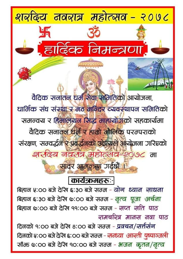 सुर्खेत । बैदीक सनातन धर्म सेवा समितीले भोली बिहिवार देखी नवरात्रभरी सरदिय नवरात्र महोत्शवको आयोजना गरेको छ । धार्मिक संघ संस्था र मठ मन्दीर व्यवस्थापन समितीको समन्वय तथा हिमालन शिद्ध महायोगको सहकार्यमा वीरेन्द्रनगर नगरपालिका वडा नम्वर ६ गणेचौकमा महोत्शव गर्न लागीएको मुल आयोजक समितीले जानकारी दिएको छ ।