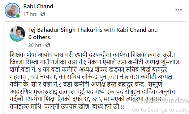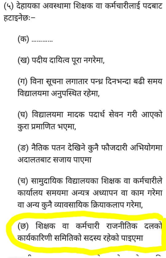 शिक्षा ऐन अनुसार प्रधानाध्यापक तथा कुनै पनि पार्टीको जिम्मेवारीमा बस्न पाउने अधिकार छैन । शिक्षा ऐेनको दफा १६ ङ ९५ ०मा भएको ब्यबस्था अनुसार उनिहरुलाइ कानुनी कारवाहि गर्न माग गरिएको छ ।