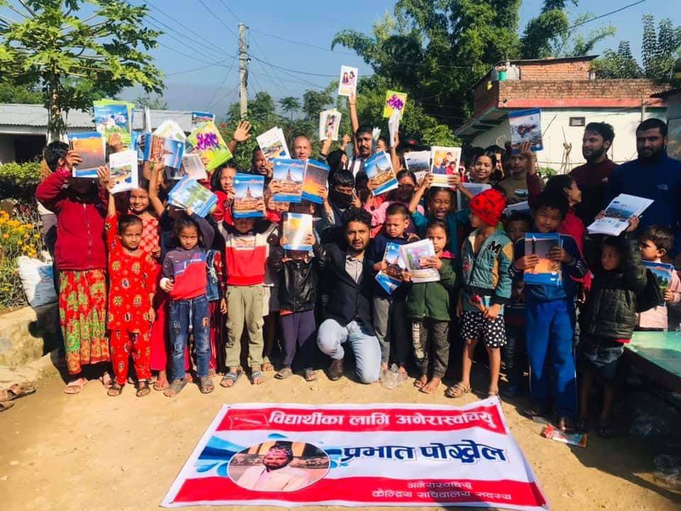 विद्यार्थीका लागि अनेरास्वबियु भन्ने मुल नारा का साथ पोख्रलले सरस्वोति टोलका करिब ८० जना बिधार्थिलाई कपि कलम बितरण गरेका हुन् ।