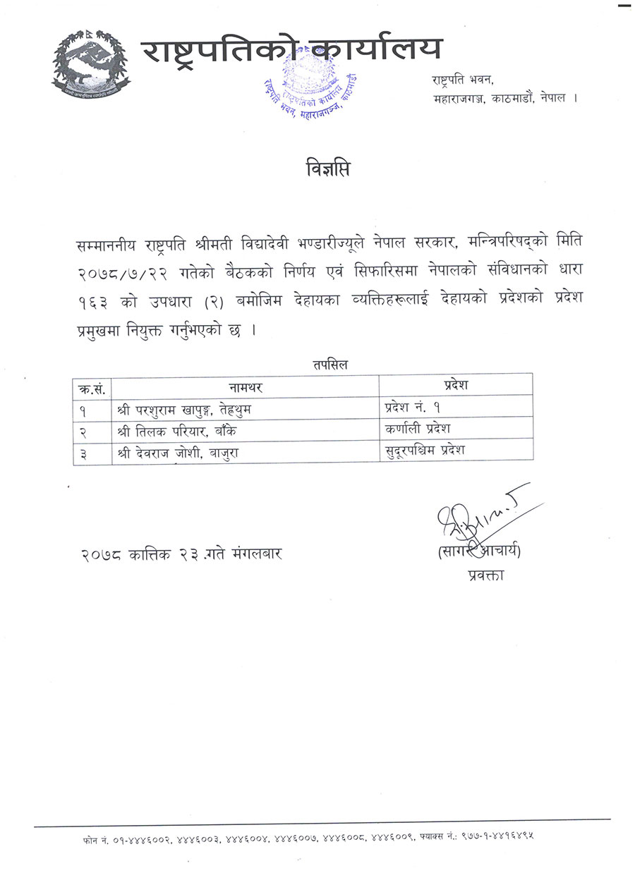 कात्तिक २२ गतेको मन्त्रिपरिषद्को सिफारिसबमोजिम राष्ट्रपति भण्डारीले मंगलबार प्रदेश १ मा परशुराम खापुङ्ग, कणर्ाली प्रदेशमा तिलक परियार र सुदूरपश्चिम प्रदेशमा देवराज जोशीलाई प्रदेश प्रमुखमा नियुक्त गर्नुभएको प्रवक्ता सागर आचार्यद्वारा जारी विज्ञप्तिमा उल्लेख छ ।