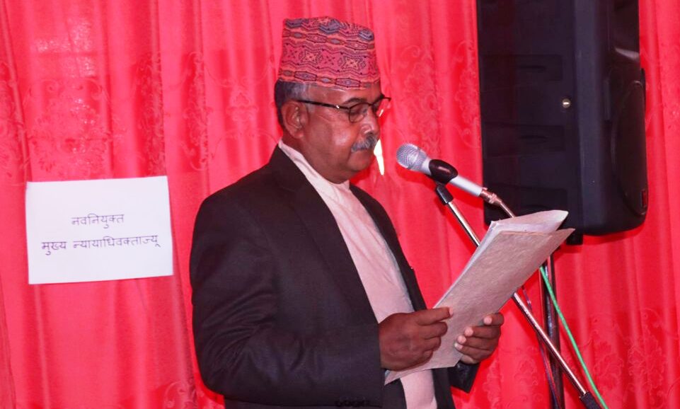 सुर्खेत । कर्णाली प्रदेश सरकारले मुख्य न्यायाधिवक्तामा नियुक्तीका लागि सिफारिस गरेका अधिवक्ता धुव्रकुमार श्रेष्ठले पद तथा गोपनियताको सपथ लिएका छन् । उनलाइ प्रदेश प्रमुखको कार्यालयमा आज पद तथा गोपनियताको सपथ खुवाइएको हो ।