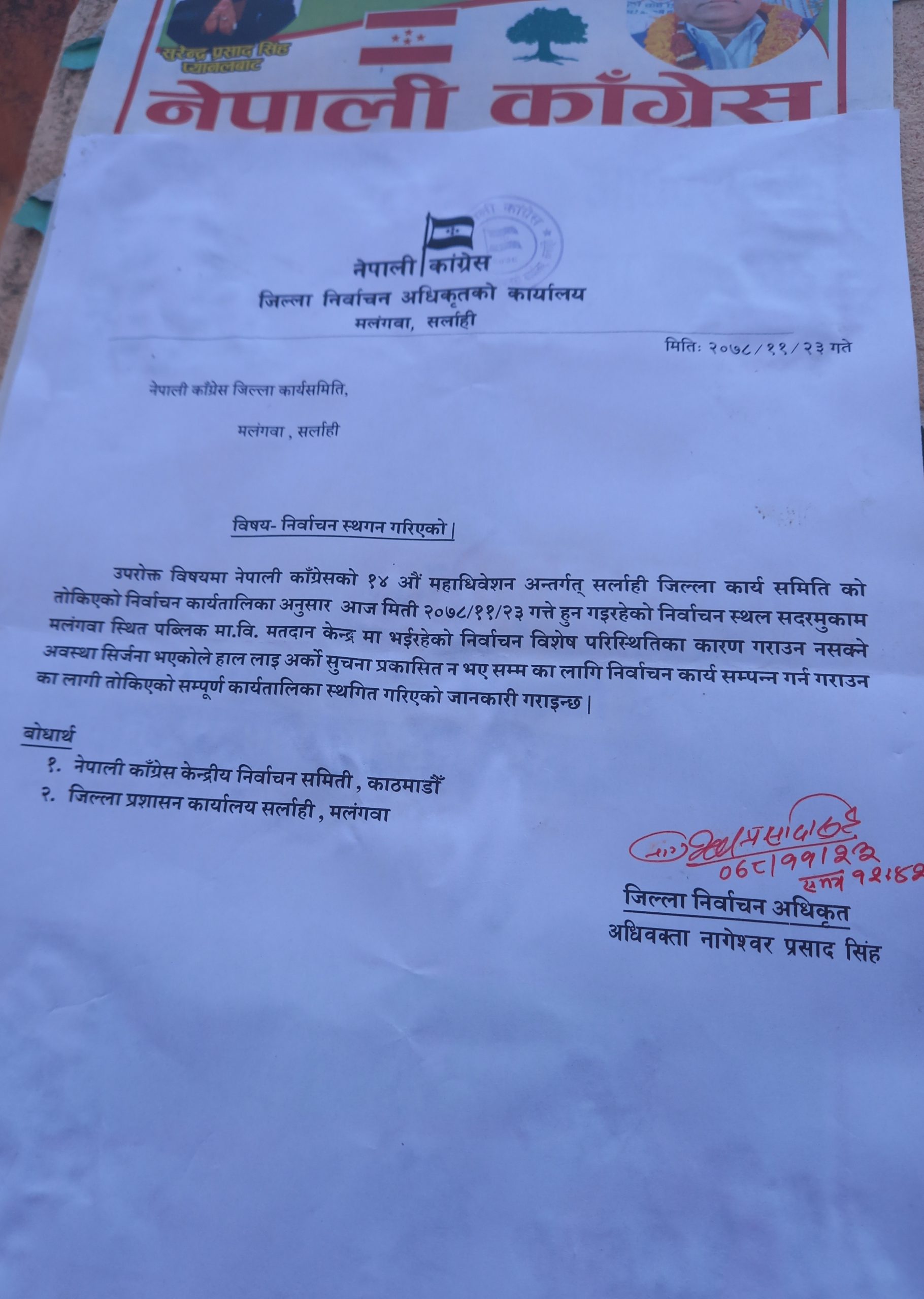 सर्लाही । नेपाली कांग्रेस सर्लाहीकाे चुनाव अनिश्चितकालका लागि स्थगित भएको छ । आचारसंहिता बनाउने विषयमा विवाद हुँदा सूचना टाँस गरेर चुनाव स्थगित गरिएको निर्वाचन समितिले जनाएको छ ।