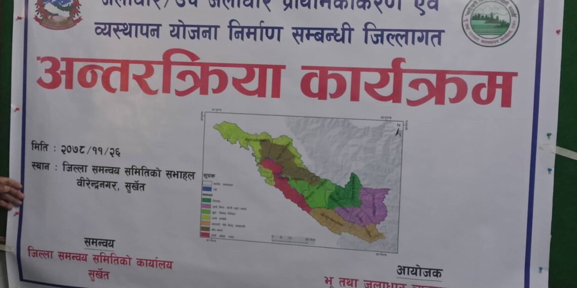 सुर्खेत। जलाधार, उपजलाधार प्राथमिकीकरण एवम् व्यवस्थापन योजना निर्माण सम्बन्धी जिल्लागत अन्तरक्रिया कार्यक्रम सुर्खेतमा आयोजना गरिएको छ । जिल्ला समन्वय समिति सुर्खेतको समन्वयमा भु तथा जलाधारा व्यवस्थापन कार्यालय सुर्खेतले अन्तरक्रिया कार्यक्रम गरेको हो ।जलाधार तथा उपजलाधारा क्षेत्रका विषयमा सुर्खेत जिल्लाको वस्तुस्थितिबारे जानकारी दिनुका साथै तीनवटै तहका सरकारको भूमिका, नीति निर्माण, योजना र कार्यान्वयनका सम्बन्धमा अन्तरक्रिया गर्ने उद्देश्यले कार्यक्रम आयोजना गरिएको भु संरक्षण तथा जलाधार व्यवस्थापन कार्यालयका प्रमुख शेर बहादुर श्रेष्ठले जानकारी दिए । श्रेष्ठका अनुसार अन्तरक्रिया कार्यक्रमबाट आगामी आर्थिक वर्षका लागि सुर्खेत जिल्लामा कार्यान्वयन गरिनुपर्ने आवश्यक योजनाका सम्बन्धमा समेत छलफल गरिएको छ ।
